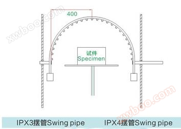 Conditions d'essai: identiques à celles du paragraphe a de l'iPx 3 ci - dessus, à l'exception des conditions décrites ci - après; La zone de pulvérisation d'eau est l'échantillon de pulvérisation d'eau à l'intérieur de chaque section d'Arc de 90 ° de chaque côté du point médian du tube pendulaire, qui est placé au Centre du demi - cercle du tube pendulaire, qui oscille de 180 ° de chaque côté de la perpendiculaire, soit environ 360 °. Environ 12s par Oscillation (2x360°);